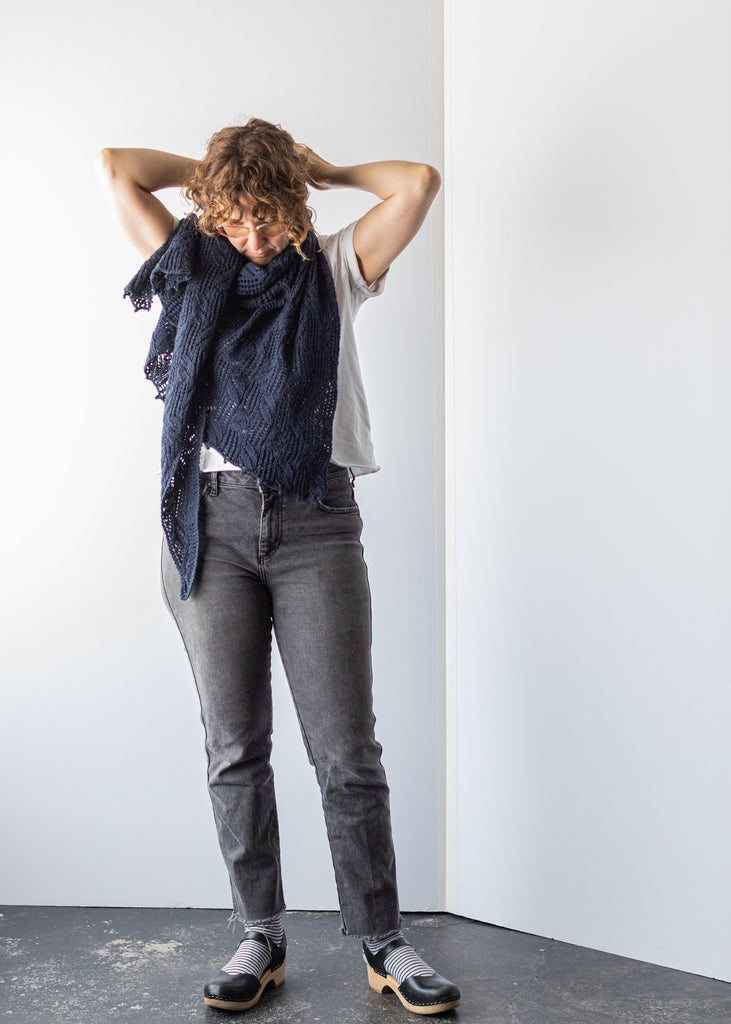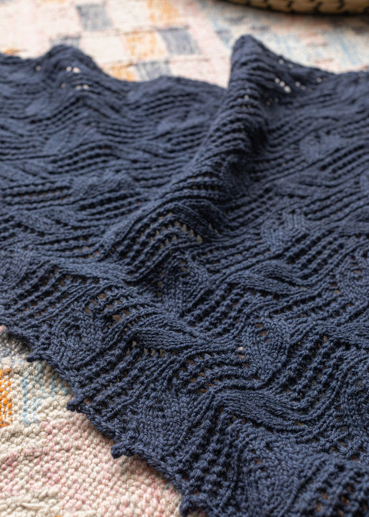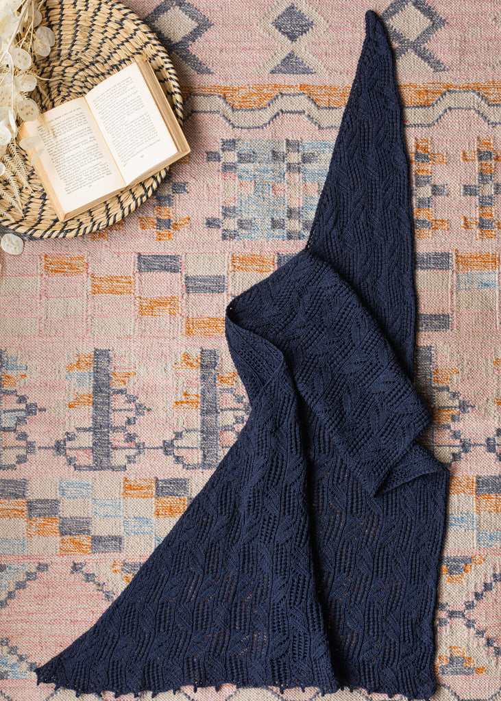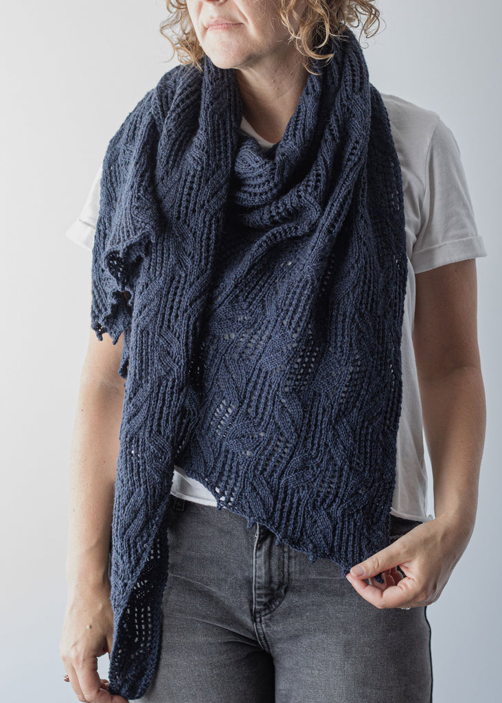 Featuring Lana Jois’s signature lace-and-faux-cables on an asymmetrical silhouette, Seawood is the ideal shawl project for high summer knitting and wearing! Made in our lightweight Weld, the motif pops off the fabric in high relief. This shawl is made from end to end starting with one stitch and finishes with a sweet picot border.